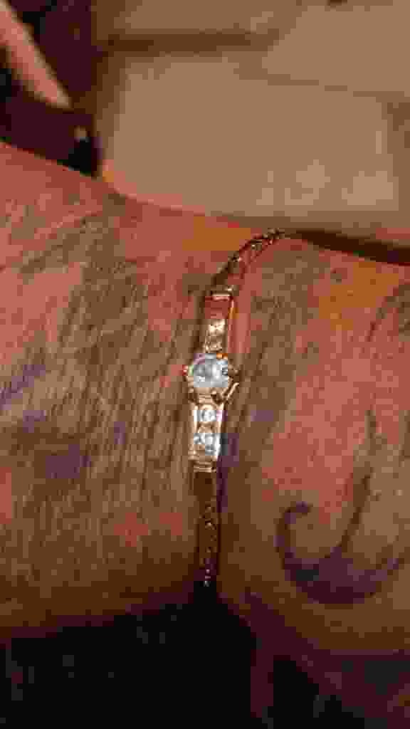 This item is a slender, yellow gold ring featuring a three-stone linear setting, likely of vintage mid-20th-century origin. The central focal point is a larger circular brilliant-cut clear stone, possibly a diamond or a synthetic substitute like cubic zirconia, held in a four-prong setting. This central stone is flanked on either side by two smaller, similarly cut clear stones, creating a graduate trifecta. The stones are set into a rectangular-shaped head or gallery. The band, or shank, appears to be relatively thin and tapers slightly toward the settings. The metal exhibits a warm, yellow-gold hue, suggesting it could be 10k or 14k gold. Regarding the condition, there is visible surface wear consistent with age and regular use; the prongs appear slightly rounded, and there is a noticeable patina or accumulation of grime beneath the stones, which dulls their brilliance. No specific maker's marks or hallmarks are visible in the provided image, but the overall construction mirrors a classic 'past, present, future' style. The craftsmanship points to a mass-produced but elegant jewelry piece from the 1960s to 1980s. The ring sits flush against the wearer's skin, indicating a low-profile design suitable for daily wear.
