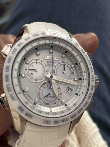 This is a high-performance Seiko Astron GPS Solar chronograph, characterized by its striking white aesthetic and advanced quartz technology. The watch features a large, durable case constructed from polished titanium with a white ceramic bezel engraved with world city abbreviations (UTC, LON, PAR, etc.) for world time functionality. The luminous white dial is intricately detailed with ten diamond-set hour markers, three sub-dials for chronograph and multi-function tracking, and a date window at the 4 o'clock position. The hands are silver-toned with a distinctive blue-steel central seconds hand for a touch of contrast. The watch is fitted with a matching white crocodile leather strap integrated into the lugs. As a GPS Solar model, it likely houses the 8X82 caliber movement, allowing for automatic time zone adjustments via satellite. The overall craftsmanship is refined, showing the high-grade materials expected from the Astron line. Condition appears excellent with minimal visible wear, though slight creasing on the leather strap and faint surface marks on the titanium casing are common for light use. This model represents a contemporary 'luxury-tech' style produced roughly between 2015 and 2018.