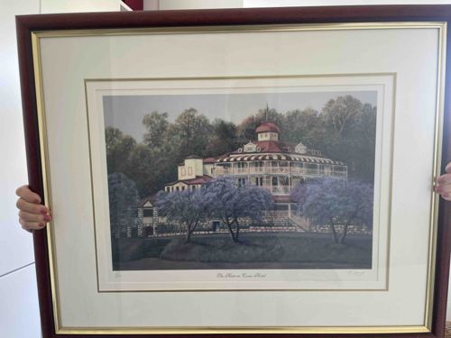 This is a professionally framed, limited edition lithographic print titled 'The Historic Como Hotel' by the artist Margaret Looney. The artwork depicts the iconic multi-story hotel in Como, New South Wales, characterized by its distinctive red domes, wrap-around verandas, and Edwardian architectural style. The scene is set against a lush background of green trees, with vibrant purple jacaranda trees blooming in the foreground, adding a seasonal Australian aesthetic. The print is numbered 67/500 on the lower left and signed by the artist on the lower right, indicating it is an early pull from a relatively small edition run. The piece is housed in a high-quality double-matting system: an off-white outer mat and a gold-toned inner fillet that complements the warmth of the print. The frame is a classic cherry or mahogany-finished wood with a slim gold inner beaded edge. The glazing appears to be standard clear glass. The overall condition looks excellent; the colors remain saturated without visible sun-bleaching or foxing on the paper. The framing is robust, showing no significant corner gaps or chips in the wood finish. Margaret Looney is known for her detailed architectural and landscape studies of Australian heritage sites, making this a significant piece for collectors of local history and regional art. The level of detail in the rendering of the hotel's masonry and ironwork reflects skilled draftsmanship and high-quality printing production.