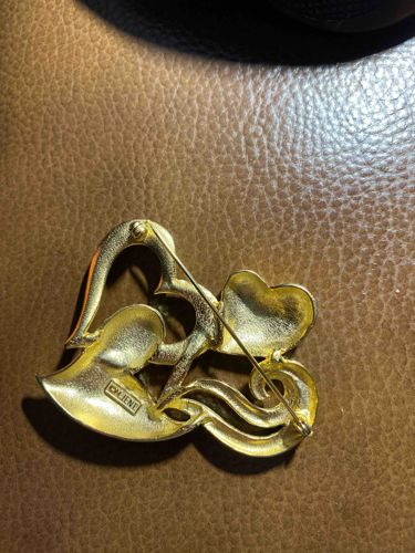 This is a vintage costume jewelry brooch featuring an interconnected triple heart motif with flowing, scroll-like aesthetic accents. The piece is constructed from a gold-tone base metal with a highly textured, sand-blasted or stippled finish on the reverse side. The design includes one large open heart silhouette intertwined with two smaller solid, convex heart shapes and elegant curvilinear waves at the base. It is equipped with a standard horizontal pin stem and a roll-over safety clasp mechanism. A prominent rectangular cartouche on the back is stamped with the maker's mark 'AJ ENT' (likely AJent). The overall condition appears excellent with minimal signs of metal fatigue or plating loss, though some light surface scratches and minor patina are visible upon close inspection. The style is characteristic of late 20th-century costume jewelry, approximately from the 1980s or 1990s. The craftsmanship shows good attention to detail with clean edges and a secure fastening assembly, typical of mid-market fashion jewelry of the era.