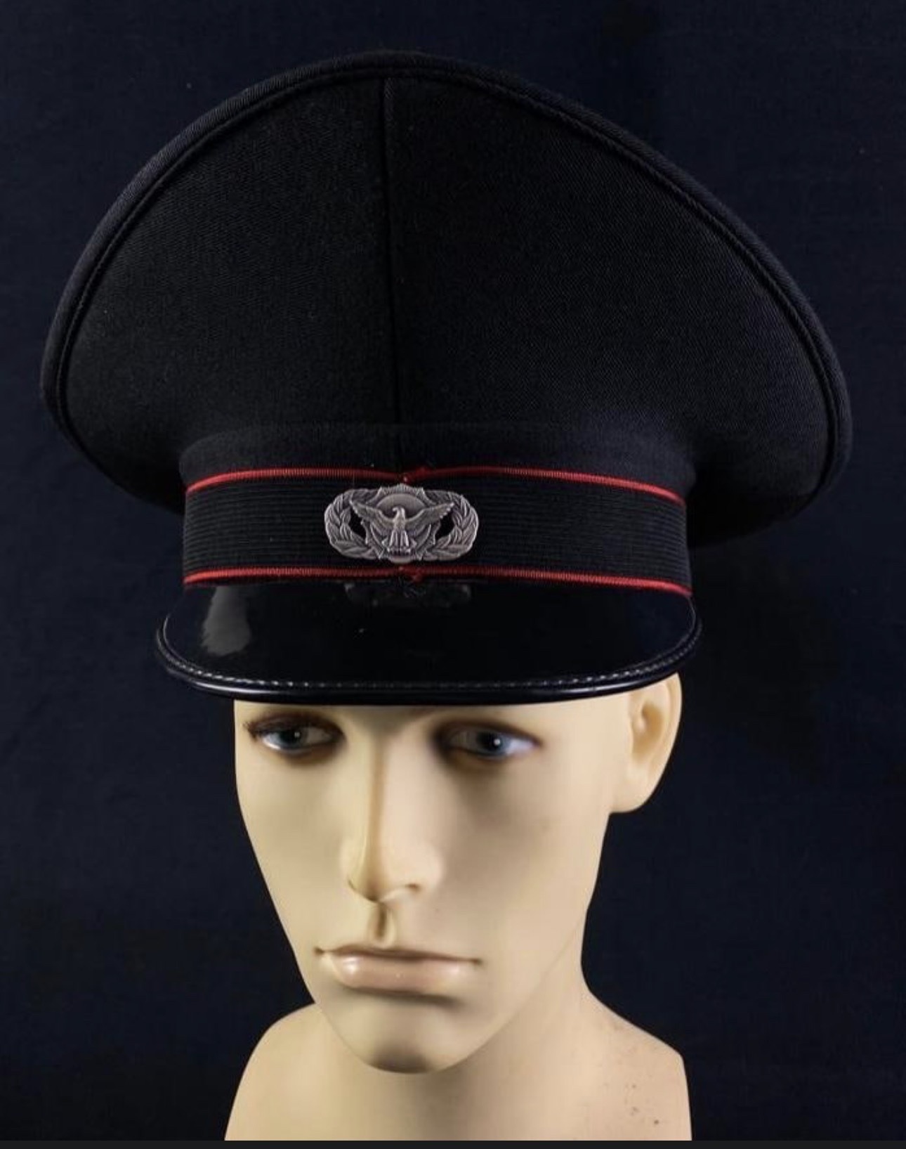 This is a full-dress peaked service cap, commonly referred to as a visor cap, associated with the Russian Railways (RZD) or related departmental security services. The cap is constructed from a heavy black wool or wool-blend fabric with a high-crowned, flared silhouette typical of Eastern European military and paramilitary headgear styles from the late 20th to early 21st century. The crown is reinforced with piping along the top edge, maintaining its rigid circular shape. A central black mohair or ribbed fabric band encircles the base, framed by two thin horizontal piping lines in a distinctive deep red or crimson color. At the center of the band is a silver-toned metallic cockade featuring an eagle with spread wings framed by a laurel wreath, a symbol often used by Russian civil departments rather than the central military. The visor is made of high-gloss black patent leather or synthetic 'vulcanised' material, featuring a rounded edge. The overall construction displays machine-stitched precision and high-quality materials intended for official uniform use. Condition appears to be excellent, showing minimal signs of wear, no visible moth damage to the wool, and a highly polished sheen on the visor. It represents a modern era of Russian service regalia, likely post-1994, reflecting the transition from Soviet-era aesthetics to modernized corporate and civil service branding.