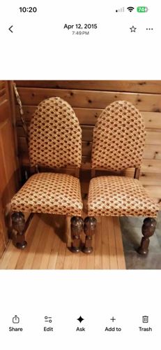 This is a pair of highly unique, custom or artisan-crafted dining or accent chairs featuring a fusion of traditional African motifs and mid-to-late 20th-century furniture design. The most striking formal element is the quartet of hand-carved legs on each chair, which take the form of elongated human figures or heads. These figural supports are carved from a dark-toned hardwood, likely mahogany or a similar dense tropical wood, displaying a rich, dark brown patina. Each chair features a high, arched 'tombstone' style backrest and a square seat, both fully upholstered in a patterned textile. The fabric appears to be a jacquard or heavy cotton weave with a recurring fan or seashell motif in shades of gold, ochre, and black, which complements the dark wood of the carvings. Construction details suggest these are boutique or studio pieces rather than mass-produced furniture, likely dating from the 1970s to the 1990s. The carving style on the legs exhibits stylized facial features and textured hair/headdresses characteristic of West African sculptural traditions. Condition-wise, the chairs appear to be in good vintage condition; however, there is visible fading on the upholstery and typical scuffing and minor indentations on the carved wooden feet consistent with floor contact and age. The structural integrity seems solid, though the fabric shows slight tension wear at the seams of the arched backs. There are no visible maker's marks or signatures in the provided image, but the level of detail in the figural carving indicates high-quality craftsmanship and a bespoke design intent.