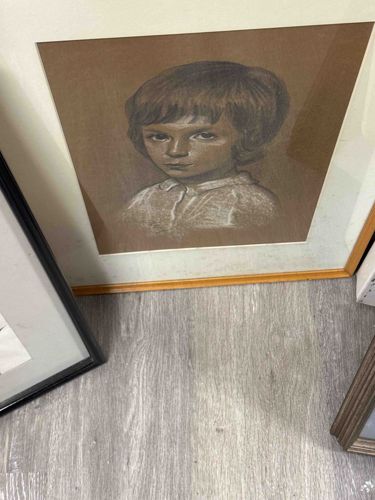 This item is a framed original portrait of a young boy, rendered in a mixed media of charcoal and white pastel or chalk on a textured, mid-toned tan paper. The subject is depicted in a three-quarter view with a direct, somber expression, styled with a classic 'mop-top' or pageboy haircut indicative of the mid-20th century. The artist utilized a high-contrast technique, using white highlights to define the shirt's collar and the contours of the face against the natural tone of the support. The drawing is housed under glass within a light wood-tone thin frame and a basic off-white mat. There is visible foxing and light brown staining throughout the matting, particularly along the bottom edge, indicating some environmental exposure or acid-burn from non-archival backing. The paper of the artwork itself appears relatively stable but may have slight tonal shifts at the edges. No signature is clearly visible in the provided image, though one may be present under the mat. The draftsmanship shows a skilled hand in figurative realism, likely dating from the 1960s to 1970s. Overall, the piece represents a sentimental example of domestic portraiture from the period.