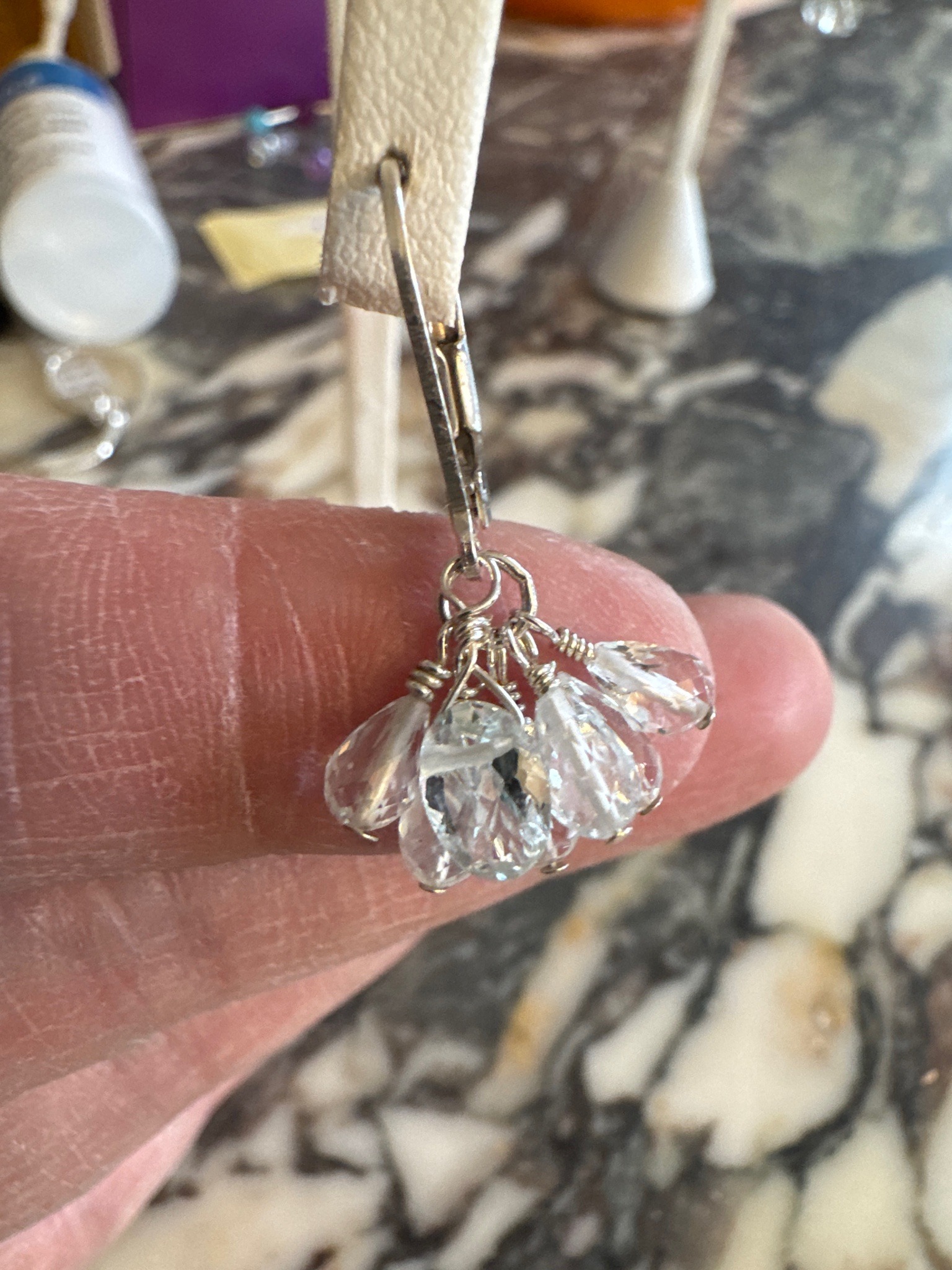 This item is a handcrafted cluster-style drop earring featuring multiple faceted aquamarine briolettes. The piece consists of at least five pale blue/near-colorless aquamarine stones, each approximately 6-8mm in length, cut into teardrop or briolette shapes. The stones exhibit a pale, icy blue hue consistent with commercial-grade aquamarine and are translucent with some visible internal inclusions. The stones are attached to a central sterling silver jump ring using a wire-wrapping technique, where fine gauge silver wire is coiled around the neck of each stone for security and aesthetic detail. This cluster drapes from a French hook or lever-back style ear wire, constructed of sterling silver with a high-polish finish. The construction suggests a contemporary artisan or 'boutique' jewelry style, likely dating from the 2000s to the present. The metal appears to be in good condition with minor tarnish (patina) visible on the wire wraps, which is typical for sterling silver. The craftsmanship is consistent with hand-assembly, showing uniform wire coils and a balanced distribution of gemstones. No major chips or fractures are immediately visible on the stones, though the internal facets show typical wear patterns for natural beryl. There are no prominent maker's marks visible in the photograph, which is common for small-scale handcrafted artisan jewelry.