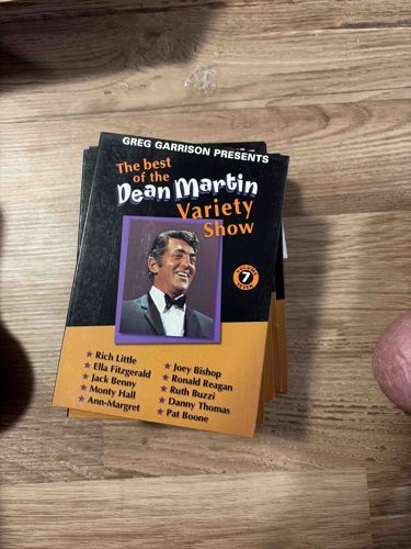 This item is a stack of DVD or media cases from 'The Best of the Dean Martin Variety Show' collection, specifically focusing on Volume 7 (Seven). The cover design features a prominent photograph of Dean Martin wearing a classic tuxedo and bow tie set against a purple-bordered frame. The cover art uses a black and orange color split, with white and orange typography reading 'GREG GARRISON PRESENTS' at the top. The lower orange section lists various guest stars featured in the volume, including Rich Little, Ella Fitzgerald, Jack Benny, Monty Hall, Ann-Margret, Joey Bishop, Ronald Reagan, Ruth Buzzi, Danny Thomas, and Pat Boone. The item appears to be a multi-disc set or a stack of individual volume cases, typical of home video releases from the late 1990s or early 2000s that archived mid-20th-century television content. The corners show some minor softening and shelf wear, particularly at the bottom edges, but the graphics remain vibrant and legible without significant fading. The physical medium is likely plastic 'keep cases' with printed paper inserts. There are no visible major cracks or tears in the casing based on the overhead view.