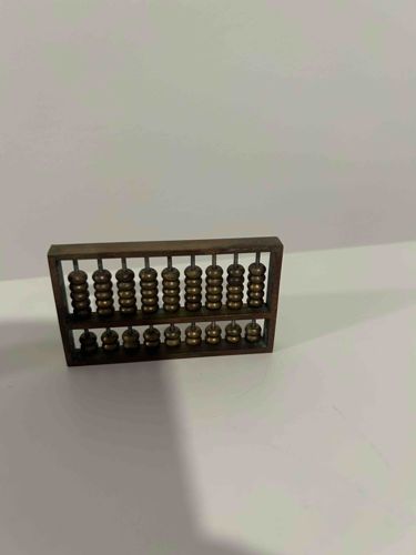 This item is a traditional Chinese style miniature abacus, known as a suanpan, constructed with a dark-stained hardwood rectangular frame. The frame features nine vertical metal rods that serve as the guide for the counting beads. It follows the classical 2/5 configuration, consisting of two beads on shorter upper deck rods representing five units each, and five beads on the lower deck rods representing one unit each per column. The beads have a biconical or flattened spherical shape and appear to be made of wood or possibly a dense resin with a metallic bronze-toned finish. The overall craftsmanship suggests a decorative or portable scale, likely measuring between 3 to 5 inches in width. The finish on the wood shows a consistent walnut-like stain with a slight satin sheen. The condition appears to be excellent vintage or contemporary condition with no visible cracks in the frame, missing beads, or bent rods. There is no visible maker's mark or signature on the exterior faces, suggesting it may be a mass-produced artisanal gift item or a desk accessory. The style is mid-to-late 20th-century traditional, often used as a symbol of prosperity and business acumen.