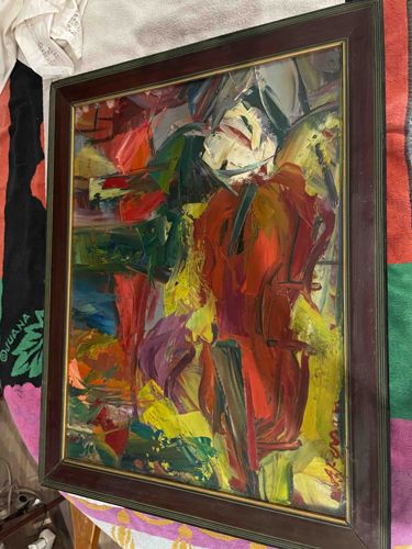 This item is an original oil painting on canvas by the French artist Antoine Ferrari (1910-1995), a prominent figure of the Toulon School. The medium consists of thickly applied oil paint using a combination of brushwork and palette knife techniques, creating a rich impasto texture that is characteristic of the artist's Post-Impressionist and Expressionist style. The color palette is vibrant and dramatic, dominated by bold reds, ochre yellows, deep emerald greens, and violets, suggesting a dynamic floral or landscape subject rendered through abstraction. The canvas is housed in a contemporary fluted wooden frame with a dark mahogany finish and a thin gold-tone inner fillet. The signature 'A. Ferrari' is visible in the lower right-hand corner, rendered in dark pigment. The painting's condition appears stable, though there is a noticeable layer of surface dust and some minor glare reflects off what may be a protective varnish; no significant paint loss or mechanical cracking is immediately visible. Ferrari's work from the mid-20th century typically reflects the light and energy of the Provence region, and this piece demonstrates his mastery of color and energetic composition. The craftsmanship is high, exhibiting the confident, gestural strokes of an established master of the Mediterranean modernism movement.