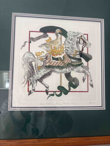 This item is a framed, multi-color limited edition etching titled 'And Mother Goose Makes Nine'. The artwork depicts a whimsical carousel horse in a prancing pose, intricately detailed with a dappled grey finish and flowery mane. Atop the horse sits a large Mother Goose and her goslings, with several ducks also perched on the horse's flank. The composition is set within a thin red square border and features a flourishing green ribbon that winds through the scene. The etching is hand-colored with shades of green, gold, and red. The piece is numbered '20/250' in the bottom left, titled in center, and signed by the artist in the bottom right corner (likely Judith Hall, known for this style and subject matter). The print is professionally matted with multiple layers, including a dark forest green outer mat and a thin grey accent mat, and is housed in a wooden frame. The etching shows an embossed plate mark around the image. Condition appears excellent with no visible foxing, fading, or paper ripples, though the frame shows some minor dust accumulation. This style suggests a late 20th-century origins, approximately the 1980s or 1990s.