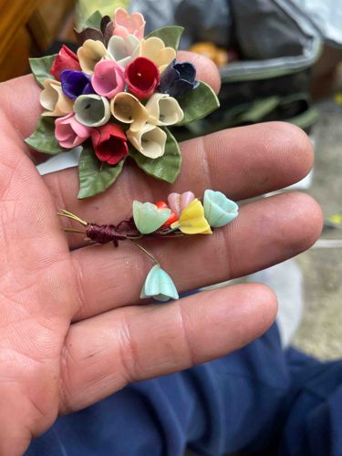 This set consists of two vintage costume jewelry brooches featuring miniature floral arrangements. The larger brooch is a dense, circular bouquet measuring approximately 2 inches in diameter, composed of numerous bell-shaped flowers in a vibrant palette including crimson red, royal purple, dusty pink, cream, and navy blue. These flowers are set against a backdrop of deep green serrated leaves. The second, smaller piece is a linear spray brooch featuring delicate pastel-toned flowers in shades of mint green, pale yellow, and soft pink, with one flower suspended on a wire to create movement. Both items appear to be constructed from early plastics, likely celluloid or a similar moldable resin, which was common in the mid-20th century (1930s-1950s). The flowers are attached to thin wire stems, with the smaller brooch showcasing visible wire wrapping at the base finished with a dark maroon thread or tape. Regarding condition, the pieces show aged patina with some accumulation of dust in the crevices of the petal cups. There is a visible fracture or loss on the pale mint flower of the smaller brooch, and the wire stems show some slight bending. The craftsmanship is typical of high-quality mass-produced novelty jewelry from the period, utilizing hand-assembly of molded components to create a realistic three-dimensional effect. No maker's marks are immediately visible, which is common for these types of botanical whimsies.