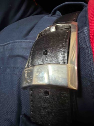 This is a luxury men's dress belt by the British brand Alfred Dunhill. The item features a wide, polished silver-tone metal buckle (likely stainless steel or palladium-plated) with a distinctive arched rectangular shape. A notable hallmark is the Dunhill 'longtail' logo engraved on the left side of the buckle frame. The belt strap is crafted from a dark brown or black grained leather with fine perimeter stitching, indicating high-quality construction. In terms of condition, there are visible surface scratches and 'swirls' on the metal buckle face consistent with regular wear and friction against clothing. The leather shows moderate signs of use, including slight creasing near the buckle area and stretching around the adjustment holes. The style is classic and contemporary, typical of Dunhill's accessory line from the early 21st century. The craftsmanship is evident in the heavy weight of the buckle and the precision of the leather edge finishing.