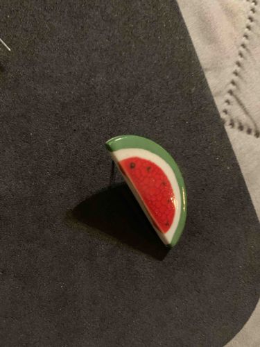 This item is a single post-style earring designed in the shape of a realistic watermelon slice. The piece is crafted from what appears to be a polymer clay or similar molded resin material, featuring a high-gloss glazed finish that provides a reflective, polished surface. Physically, it is a semi-circular wedge approximately 1 to 1.5 centimeters in length. The color palette follows a classic watermelon motif: a vibrant lime-green outer rind, a thin white inner pith layer, and a rich strawberry-red center flesh. A notable detail includes four hand-painted or applied black dots representing seeds, which are scattered across the red surface. The texture of the red section shows a subtle, granular stippling to mimic fruit fibers. The construction includes a metal post attached to the reverse side, centered for balance when worn. In terms of condition, the item appears to be in good used condition with no visible chips or cracks in the glaze, though minor micro-scratches consistent with wear may be present. The style is late 20th-century to contemporary novelty jewelry, likely mass-produced or hand-finished from a boutique craft setting. There are no visible maker's marks or stamps on the front-facing surface, which is common for this scale of costume jewelry.