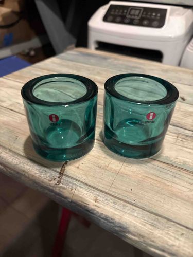 This is a set of two high-quality, pressed-glass votive candle holders from the iconic 'Kivi' line, designed in 1988 by Heikki Orvola for Iittala, Finland. The items are characterized by their thick, heavy-walled cylindrical construction, which showcases the deep teal / sea blue coloration and refracts light beautifully. Each holder stands approximately 60mm tall with a minimalist, handleless profile. Both pieces prominently display the original red 'i' Iittala-logo decal, indicating authenticity and likely a more modern production date (late 20th to early 21st century). The glass appears to be in excellent used condition with no visible chips or cracks. The clarity of the glass and the absence of mold seams are characteristic of Iittala's high manufacturing standards and mass-colored glass technique, where the color is consistent throughout the material. This design is widely considered a masterpiece of Scandinavian mid-century modern influence, valued for its simplicity and the way the thick base enhances the flame's glow. Small air bubbles or slight variations in color are common in Finnish glasswork, though these specimens appear quite uniform. These are highly collectible home decor staples of Finnish design history.