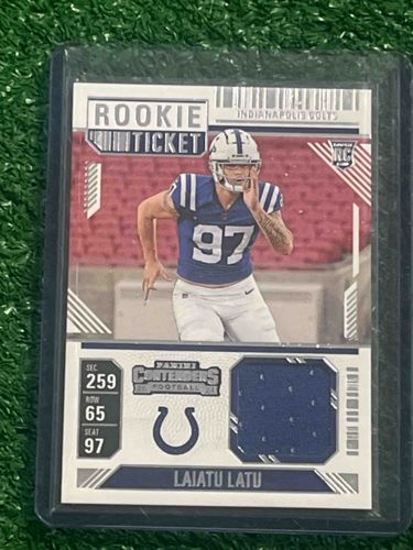 This is a 2024 Panini Contenders Football trading card featuring rookie defensive end Laiatu Latu of the Indianapolis Colts. The card is designed with the iconic 'Rookie Ticket' aesthetic, mimicking the appearance of a stadium event ticket with faux section, row, and seat numbering (Sec 259, Row 65, Seat 97). The physical construction consists of a standard-sized card stock with an integrated 'patch' or jersey swatch embedded within a die-cut window on the lower right quadrant. The swatch is a navy blue fabric, consistent with the team's official colors. The card face features a high-definition photograph of Latu in his blue home jersey and white helmet. Key branding includes the 'RC' rookie logo and the Panini Contenders 2024 logo. The card is currently housed in a protective plastic top-loader, which has preserved its condition; the corners appear sharp, and the centering looks standard for the manufacturer. There are no visible signs of surface scratching, creasing, or edge wear in the provided image. This item represents a modern collectible from the 2024 NFL rookie class, characterized by its multi-layered construction and authentic memorabilia inclusion.