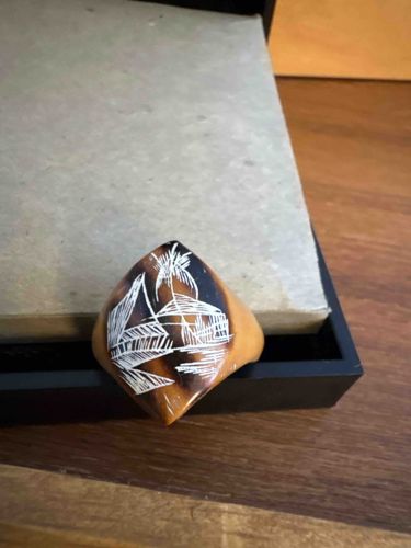 This is a contemporary fashion ring, likely hailing from Indonesia, featuring a distinctive lozenge or diamond-shaped face. The piece is constructed from a dual-tone material that mimics natural horn or tortoiseshell, likely a molded resin or polished wood composite with a dark brown-to-amber gradient finish. The central decorative element is a white, hand-etched 'scrimshaw' style design depicting a tropical scene with palm trees and a traditional stilt-house or bamboo hut. The engraving is rudimentary, characterized by fine, scratch-like white lines that contrast sharply against the dark background. The ring has a smooth, polished surface with a rounded band. Regarding condition, it appears to be in good vintage or used condition with minor surface abrasions consistent with its age and material. There are no visible maker's marks or metal hallmarking, suggesting it is a handcrafted souvenir item rather than fine jewelry. The craftsmanship is folk-art style, typical of mid-to-late 20th-century artisan goods meant for the tourist trade. The overall quality is consistent with mass-produced but hand-finished costume jewelry, utilizing local materials to create a lightweight, ethnic-style accessory.