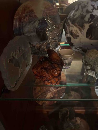 This item is a decorative wood sculpture, likely crafted from a redwood burl or a cypress knee, showcasing the rich, convoluted grain patterns characteristic of burl wood. The piece is finished with a high-gloss varnish or resin coating that amplifies its natural reddish-brown and amber hues. Measured as a medium-sized tabletop accent, its form is irregular and organic, possessing the knobby, swirling texture inherent to growth outcroppings found on specific tree species. Its craftsmanship highlights the raw, natural aesthetic popular in mid-to-late 20th-century folk art and souvenir woodcraft. Visible in a glass display cabinet, the sculpture appears to serve as a base or companion piece to a crystal or glass bird figurine mounted above it. The condition appears well-maintained with a consistent sheen, though minor surface dust is present. Notable features include the intricate 'eyes' and swirling knots within the wood, which provide a topographical quality to the surface. It likely dates from the 1970s to 1990s, a period when such organic wood art was highly sought after in Pacific Northwest and Coastal regions.
