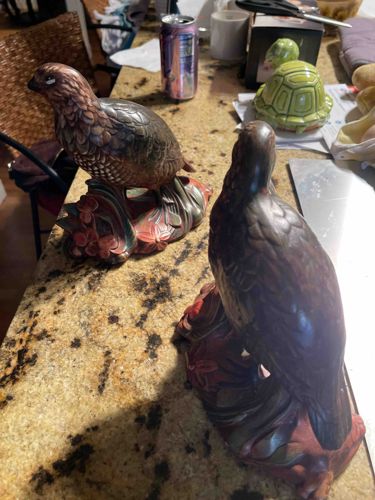 A vintage pair of decorative porcelain bird figurines, specifically depicting quails or partridges. These items exhibit a realistic sculptural style with molded feather textures and detailed hand-painted finishes. The color palette consists of earthy browns, burnt oranges, and muted greens, intended to mimic the natural camouflage of game birds. Each bird is perched atop a naturalistic base depicting foliage and red berries. The material is a heavy biscuits or glazed porcelain, characteristic of late 20th-century Japanese imports (likely Andrea by Sadek or a similar decor line from the 1970s-1980s). The craftsmanship shows good attention to detail in the anatomical proportions and the relief work of the feathers. Regarding condition, the pieces appear physically intact without major structural chips or cracks visible, though there is general surface dust and minor shelf wear consistent with age. One bird shows a small white mark near the eye which could be a manufacturing glaze skip or a minor surface scrape. The matte finish suggests they were designed as interior decor accents rather than functional pieces. These are typical of mid-to-late 20th-century Asian-manufactured porcelain intended for the Western giftware market.