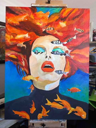 This is a 30”x 40” original acrylic painting on canvas, currently displayed on a studio easel. The piece features a stylized portrait of a woman with pale skin, vibrant orange lips, and prominent turquoise eye shadow. Her hair is rendered in expressive, fiery strokes of red, orange, and yellow that blend into the blue background. A central motif of the work is the interaction between the figure and numerous fish; several black-and-white striped fish swim across her face and through her hair, while bright orange goldfish-like figures appear to swim across her dark-clothed torso and the lower blue depth. The style is contemporary surrealism with an emphasis on bold color and gestural brushwork. The physical condition appears excellent with no visible cracking or fading. The canvas is unframed, showing the raw edges typical of a work in progress or a modern display preference. The application of the acrylic is impasto in areas of the hair, providing a tactile texture. There are no clearly visible signatures on the front in this image, suggesting it may be signed on the reverse or is a contemporary piece by an emerging artist. The craftsmanship demonstrates a strong understanding of color theory and figurative abstraction.