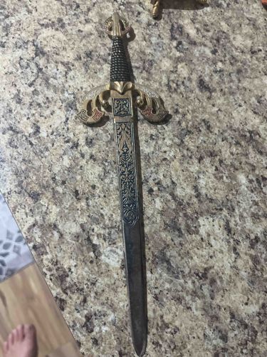 This is a highly ornate decorative dagger, likely a souvenir item produced in Toledo, Spain, known for its traditional damascene work. The piece features a straight, double-edged blade adorned with intricate gold and black etched patterns along the upper two-thirds, showing characteristic floral and scrollwork motifs. The hilt is composed of a textured, diamond-patterned black grip that provides a secure aesthetic feel. The crossguard is particularly elaborate, displaying a forward-curved design with golden scrollwork and red and black enamel accents that mimic the historic Spanish style. The pommel is a rounded, cage-like structure in a matching gold finish. Historically, these items are crafted from non-high-carbon stainless steel or zinc alloys, intended for display rather than functional use. The blade shows visible signs of surface oxidation and spotting, particularly toward the tip, which reflects improper storage or age-related moisture exposure. The decorative gilding on the guard shows minor wear but retains much of its luster. This piece likely dates from the late 20th century, approximately 1970-1990, and represents mid-range craftsmanship typical of the Spanish tourist trade of that era.