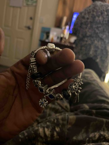 This is a contemporary snake chain style charm bracelet, heavily influenced by the Pandora aesthetic. The bracelet is constructed from a silver-toned metal, likely sterling silver or a silver-plated base metal, featuring a barrel-style clasp and a safety chain to prevent loss. The chain is adorned with approximately 8-10 decorative charms of varying designs. Notable charms include faceted dark glass or resin beads, filigree metal spheres, a star-shaped dangle charm, and a circular medallion charm featuring geometric cutouts. The metal displays a polished finish with darkened oxidation in the recessed filigree areas to provide contrast and a 'vintage' look. The construction suggests a modern mass-market origin, typical of the 21st-century charm bracelet trend. In terms of condition, the piece appears well-maintained with light surface scratches consistent with occasional wear. There are no missing stones or significant structural deformations visible in the image. This style of jewelry is valued for its personalization, as each charm is typically added individually to represent personal milestones or aesthetic preferences. The craftsmanship is decent for commercial fashion jewelry, with uniform casting and secure attachment points for the charms.