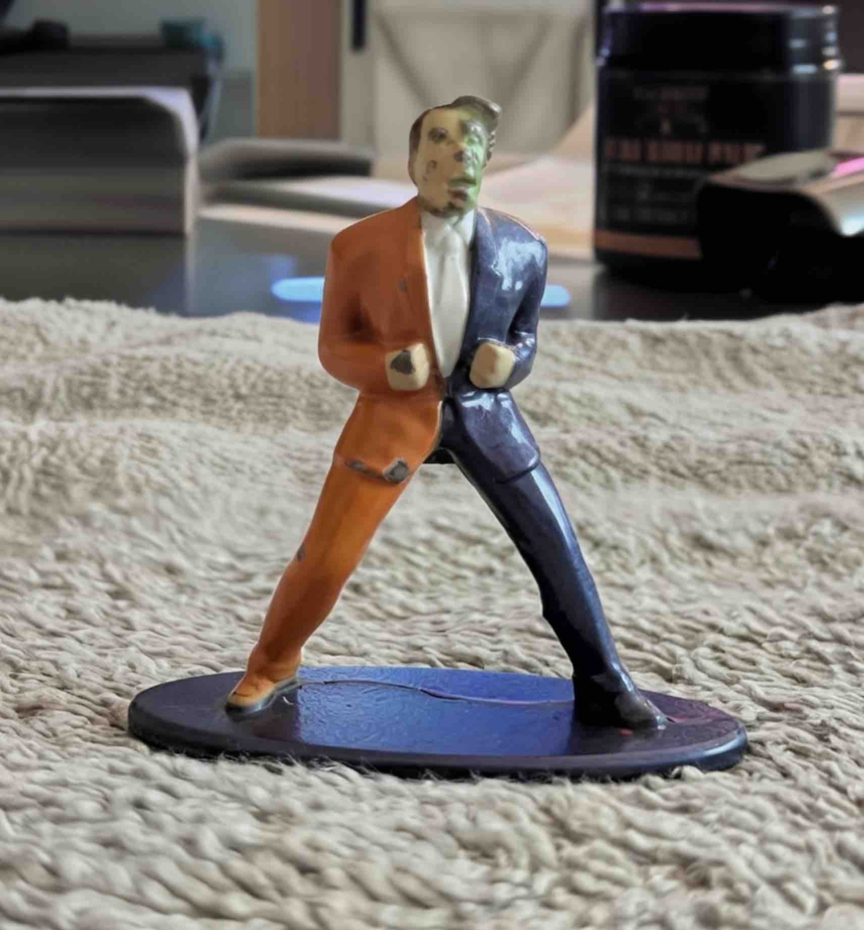 This is a vintage small-scale miniature figure depicting the DC Comics villain Two-Face (Harvey Dent). The figure is constructed of cast metal, likely lead or a lead alloy, standing approximately two inches tall on an oval-shaped base. The sculpture shows the character in his classic bifurcated suit, with the viewer's left side colored in a bright orange and the right side in a dark navy blue or purple, separated by a white shirt and tie down the center. The face is also split, with one half showing normal human features and the other a green, distorted 'monstrous' appearance. The condition is poor to fair, showing significant paint loss and 'flea bites' on the orange side of the coat and the hands, as well as general scuffing on the base. The style of the mold suggests a production date between the 1940s and 1960s, possibly part of a set of comic book figurines. The craftsmanship reflects the hand-painted techniques of mid-century gaming or toy miniatures, with visible brush strokes and slight misalignment in the color split. There are no visible maker's marks or stamps on the front surface.