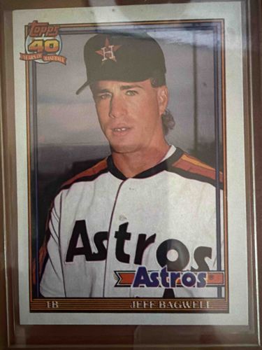 This is an original 1991 Topps baseball card featuring Houston Astros legend Jeff Bagwell, which serves as a key rookie card for the Hall of Fame first baseman. The card measures the standard 2.5 by 3.5 inches and is printed on typical Topps cardboard stock from the early 1990s. The front design features a portrait of Bagwell in his white Astros jersey and black cap, framed by a distinctive multi-colored border consisting of orange, yellow, and black pinstripes. A prominent 'Topps 40 Years of Baseball' logo is visible in the upper left corner, celebrating the company's anniversary. The player's name and position ('1B') are located at the bottom in a stylized bar. Condition-wise, the centering appears slightly biased towards the right border. The corners show very minor softening consistent with age, and the white borders retain a relatively clean appearance without significant staining. There are no visible creases or heavy surface scratches, though the image is captured through a clear protective holder. In terms of manufacturing, the 1991 Topps set is known for its grey cardstock and was produced in high volumes during the 'junk wax' era, which impacts its rarity despite Bagwell's high-profile career status.