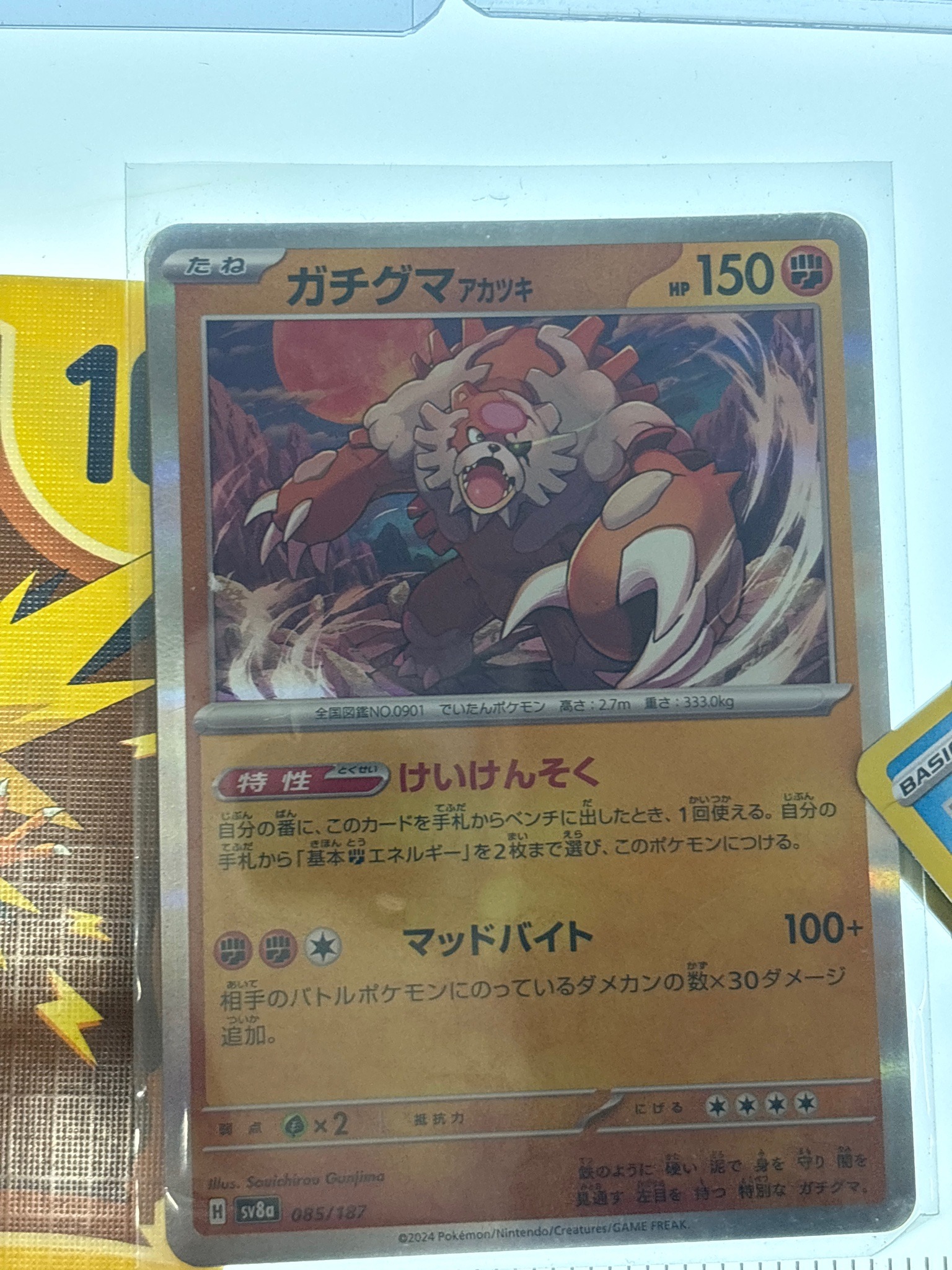This is a Japanese-language Pokémon Trading Card featuring the character Bloodmoon Ursaluna (Gachiguma Akatsuki). The card is a Fighting-type Basic Pokémon with 150 HP, identified by the set code 'sv8a' and numbering 085/187 from the 'Terastal Festival ex' set released in 2024. The artwork, illustrated by Souichirou Gunjima, depicts the bear-like creature in a dynamic, aggressive pose with large claws and a red lunar motif in the background. Construction is high-quality cardstock typical of the modern Pokémon TCG era, appearing to be a standard non-holo or reverse-holo variety as indicated by the silver/grey borders. Key text includes the 'Experienced' (Keikenzoku) Ability and the 'Mad Bite' attack. Regarding condition, the card is currently housed in a clear protective sleeve. From a visual inspection, the centering appears relatively balanced, though there is a minor silvering/white speck visible on the top right corner and some slight edge wear consistent with a recently handled card. The copyright markings at the bottom confirm its 2024 production by Nintendo/Creatures/GAME FREAK.
