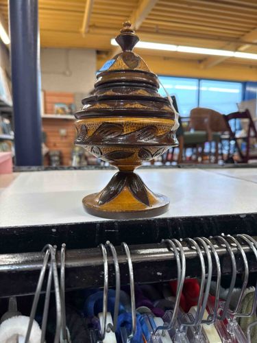 This is a decorative, hand-carved wooden vessel appearing to be of mid-20th-century origin, possibly a souvenir or artisanal piece from South Asia or North Africa. The object features a multi-tiered, tapered construction with a matching lid topped by a pointed finial. Its physical characteristics include a two-toned color palette, achieved through a combination of light-colored wood (likely a tropical hardwood or stained pine) and dark brown accents, possibly created via wood burning (pyrography) or deep staining. The decorative motif consist of repetitive, hand-chiseled leaf and teardrop patterns that wrap horizontally around the body and base. The vessel sits on a pedestal base that flares out into a circular foot. Notable for its folk-art aesthetic, the craftsmanship shows some irregularity in the carving, indicating hand production rather than a machine-line process. Visible condition appears fair; there is some light surface wear, dust accumulation in the carved grooves, and minor scratches consistent with age. A small blue price tag is visible on the upper section, and a thin white string (likely a tag attachment) hangs from the side. The overall height is estimated at 6 to 8 inches. Its style is indicative of global woodcraft traditions from the 1960s or 70s, prioritizing textured surfaces and geometric floral abstractions.