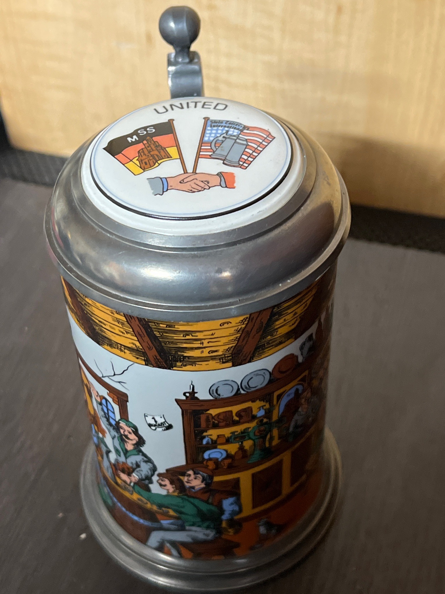 This is a contemporary ceramic beer stein produced by the renowned Villeroy & Boch factory in Mettlach, Germany. The piece is constructed from high-quality white stoneware with a vibrant, wrap-around chromolithograph decoration depicting a bustling traditional tavern scene featuring patrons, wooden beams, and shelving with blue-and-white pottery. The stein features a flat pewter lid with a ceramic inlay. The inlay displays two shaking hands under the word 'UNITED,' flanked by the German flag (marked 'MSS') and the American flag (marked 'Stein Collectors International'). This design signifies a partnership or convention between German and American collectors. The pewter hardware includes a sturdy hinge and a standard ball-style thumb lift. Physically, the item appears in excellent gallery condition with no visible cracks, chips, or grazing on the ceramic body. The pewter shows a light, even patina consistent with age but remains free from significant denting or oxidation. Based on the Stein Collectors International (SCI) branding, this item likely dates to the late 20th century, specifically marking a convention or club milestone. The craftsmanship reflects Mettlach's continued tradition of detailed graphic application and robust assembly.
