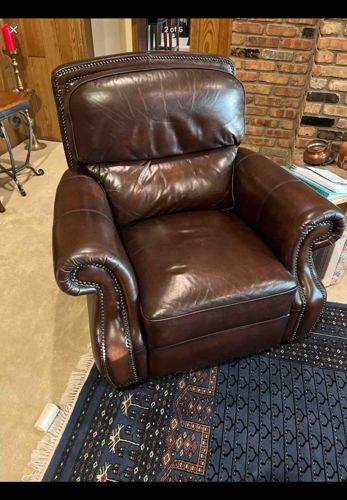 This is a substantial, traditional-style reclining armchair upholstered in high-quality, top-grain dark espresso or chocolate brown leather. The chair features a classic silhouette with rolled arms and a tall, tripartite tiered backrest providing significant lumbar and neck support. A defining aesthetic feature is the extensive use of antiqued brass-tone nailhead trim, which follows the contours of the rolled arms and the arched top of the backrest. The leather exhibits a soft, supple texture with a natural sheen and visible 'pull-up' characteristics, indicating an aniline or semi-aniline finish that develops a patina over time. Regarding condition, the leather shows healthy signs of usage, including light surface creasing and minor softening of the seat cushion, suggesting it is well-broken-in but structurally sound with no visible tears or major abrasions. The craftsmanship is evident in the precise stitching and the tight, symmetrical application of the decorative studs. This piece likely dates from the late 20th to early 21st century and exemplifies the 'Old World' or 'Executive' furniture style often found in upscale libraries or home offices.