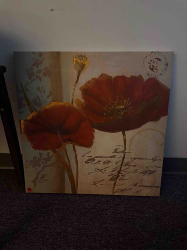 This item is a contemporary mixed-media style decorative wall art piece featuring a prominent floral motif of red poppies. The construction appears to be a digital giclée print on a stretched canvas, likely wrapped over a wooden internal frame (gallery wrap style) without an exterior decorative frame. The color palette is dominated by warm earth tones, including terracotta reds, ochre, crema, and sepia. The composition includes two large, stylized poppy blossoms and a single bud, accented with metallic gold-toned highlights that suggest gold leaf or metallic paint application. The background is layered with faux-vintage elements, including script-writing in a cursive hand, a faded floral secondary pattern in the upper left, and a circular postmark stamp in the upper right. These elements aim to emulate a Parisian or Victorian-era postcard or botanical illustration style. The condition appears to be fair to good, with no visible tears or significant staining, though the edges and corners may show light rubbing consistent with residential use. There is a small red circular sticker located on the bottom-left corner, likely used for inventory or pricing purposes. This piece represents modern high-volume commercial art production from the late 20th to early 21st century, designed for home decor markets.