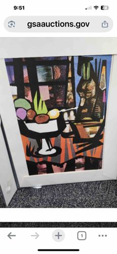 This item is an abstract geometric artwork presented in a modern white frame. The composition appears to be a stylized still life, featuring a bowl of fruit set against a complex, multi-layered background that suggests an interior window scene or a cubist-inspired architectural space. The color palette is vibrant, utilizing bold primary and secondary colors including deep blues, oranges, greens, and purples, all anchored by heavy black outlines that define the various shapes. The artwork technique suggests a collage-style application or a high-quality print, with sharp delineation between color blocks. The frame is a clean, contemporary white profile that suggests a late 20th or early 21st-century production. Physical condition appears good based on the photographic evidence, with no obvious surface abrasions or moisture damage to the print itself. The frame shows some minor scuffing consistent with general handling. The overall style draws influence from mid-century modern cubism and pop art, emphasizing flat planes of color and graphic silhouettes rather than realistic depth. The scale appears moderate, likely suitable for residential or office display as indicated by its placement on commercial-grade carpeting. No specific artist signature is visible in this low-resolution image, but the craftsmanship reflects a professional commercial production quality intended for modern decor environments.