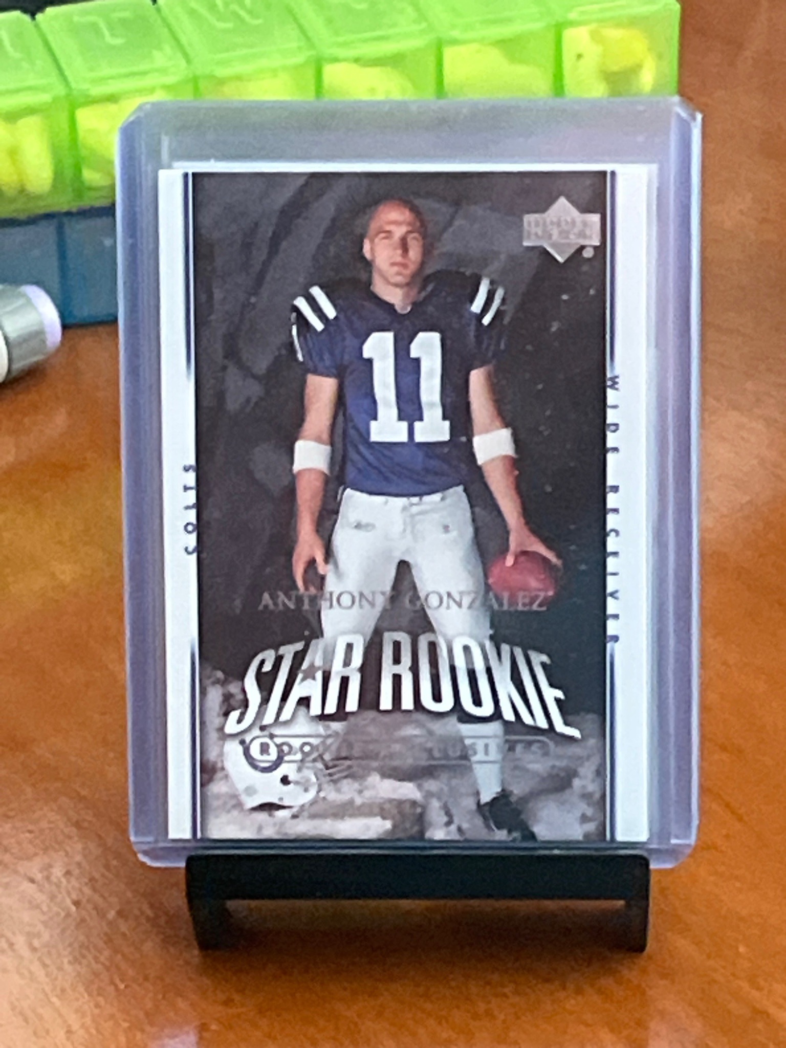 This is a 2007 Upper Deck football trading card featuring Anthony Gonzalez, a wide receiver for the Indianapolis Colts. The card is part of the 'Star Rookie' subset, as indicated by the prominent white stylized text across the lower third of the image. The card's design features a full-body studio photograph of Gonzalez in his home blue Colts uniform, holding a football with his helmet resting on the ground near his right foot. The background is a textured, dark gray, cave-like graphic. The Upper Deck logo is visible in the top right corner. The player's name, 'ANTHONY GONZALEZ,' is printed in a gold-colored serif font above the main headline. The card is standard size (2.5 x 3.5 inches) and is constructed of typical cardstock with a glossy finish. It is currently housed in a clear protective plastic top-loader sleeve, which is resting on a small black display stand. Based on the visual inspection, the card appears to be in excellent condition with crisp corners and clean edges, though the centering seems slightly shifted toward the top. There are no obvious surface scratches, creases, or fading visible through the protective holder. The branding and design indicate this is a mass-produced modern sports collectible from the late 2000s.