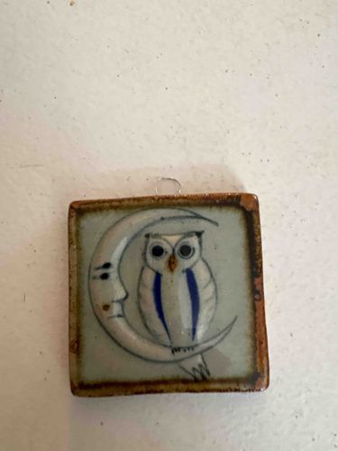 This is a small, hand-painted ceramic tile pendant or decorative plaque featuring the signature folk art style of Mexican artist Ken Edwards. The piece is square in shape, approximately 1.5 to 2 inches in size, with a small wire loop embedded at the top for suspension. The central motif depicts a stylized owl perched within the curve of a crescent moon, which features a whimsical human face. The color palette is characteristic of Tonala stoneware, utilizing soft celadon or 'palo sienna' background glazes with accents of cobalt blue, earth tones, and dark detailing for the eyes and outlines. The border is finished with a rustic, speckled brown glaze that shows the natural grit of the stoneware. This specific folk art style, known as 'El Palomar,' emerged in the mid-20th century. The condition appears fair to good; there is visible wear around the edges, including several small chips and loss of glaze particularly on the upper right and left corners, revealing the reddish-brown clay body beneath. This type of artisan pottery is valued for its hand-crafted individuality and its place within the historical context of Jalisco ceramics.