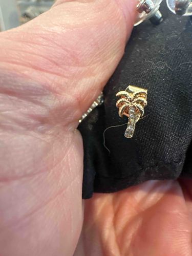 This item is a single stud earring shaped like a miniature palm tree. The piece is constructed from a polished yellow gold-tone metal, which suggests it is likely costume jewelry rather than high-karat solid gold. The design features a stylized palm canopy with textured fronds at the top. The trunk of the tree is Pav-set with approximately five to six small, circular clear stones, identified as glass rhinestones or cubic zirconia based on their cut and setting style. The earring is secured with a standard post and a friction butterfly-style clutch back. In terms of condition, the item appears fairly modern and shows minimal signs of wear; the gold finish is intact without significant pitting or oxidation, and all stones appear to be present. The scale is petite, measuring roughly 10-12mm in height. No visible hallmarks or maker's marks are present in the provided view, which is common for mass-produced fashion jewelry from the late 20th to early 21st century. The craftsmanship is standard for commercial costume pieces, focusing on aesthetic charm and whimsical summer themes.