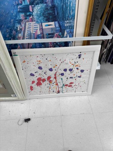 This item is an original abstract painting or mixed-media work on paper, characterized by a dynamic 'action painting' or drip technique. The composition features a white background heavily textured with multicolored splatters and larger gestural blotches of paint. The primary color palette includes vibrant shades of purple, crimson red, orange, and teal green, with smaller black or dark-toned speckles interspersed throughout. The paint application varies from fine mist-like sprays to thick, impasto-like drips, creating a sense of movement and spontaneity. The artwork is housed in a contemporary, semi-glossy white wooden or synthetic frame with a simple flat profile. The piece appears to be protected by glass or acrylic glazing. Regarding its condition, the frame shows some minor surface scuffing and dust accumulation, typical for items in a retail or gallery setting. There is a small identification tag or price sticker visible in the upper-left corner of the frame. No clear artist signature is visible from this distance, but the style is reminiscent of late 20th-century to contemporary abstract expressionism. The piece measures approximately 24x30 inches based on surrounding context. The overall craftsmanship suggests a decorative or independent artist's production rather than a high-end classical masterwork.