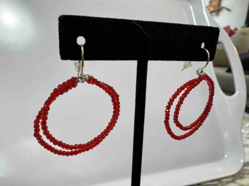 This pair of drop earrings features a distinctive double-hoop design crafted from vibrant Siam red faceted crystals, notably identified as Swarovski. Each earring consists of two concentric or overlapping circular hoops of varying sizes, composed of small, precision-cut roundelle beads. These beads are meticulously strung on a fine wire framework that maintains a flexible yet consistent circular silhouette. The hardware consists of sterling silver (.925) French hook or fishhook style ear wires with simple loop attachments. The crystals exhibit high clarity and a brilliant light-refracting quality characteristic of genuine Swarovski crystal production. The construction suggests contemporary handcrafted jewelry tailoring, with the sterling silver providing a hypoallergenic and precious metal component. There are no visible chips to the glass facets or significant tarnish to the silver hooks, indicating they have been well-maintained. The contrast between the brilliant red glass and the bright polished silver creates a bold, festive aesthetic. While no specific maker's mark is visible on the small surface of the ear wires in the image, the uniformity of the crystal facets indicates high-quality manufacturing typical of mid-to-late 20th-century or early 21st-century fashion jewelry.