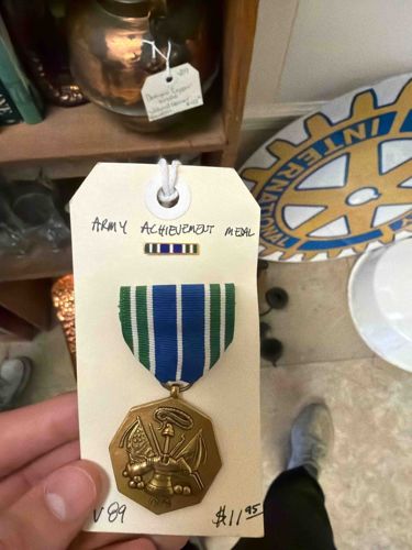 This item is an authentic United States Army Achievement Medal, accompanied by its matching service ribbon bar. The medal is fashioned from bronze and features a distinctive octagonal shape. The obverse side displays a central design based on the Department of the Army seal, featuring a cuirass, a liberty cap on a pike, and various military accoutrements including cannons and mortar balls. Above the central motif is the date '1775'. The medal is suspended from a high-quality silk or synthetic moiré ribbon characterized by a central blue stripe, bordered by thin white stripes and wide green stripes on the edges. The construction appears to be cast metal with a matte bronze finish typical of post-1981 military awards. In addition to the full-size medal, the set includes a small enameled or fabric ribbon bar used for casual wear on uniforms. The condition appears excellent with minimal oxidation or patina, suggesting it has been well-preserved. There are no visible chips in the metal or fraying on the ribbon. The item is displayed on a white cardboard retail tag with handwritten identifying information, typical of an antique or military surplus store setting. This award was established in 1981 to recognize meritorious service or achievement of a lesser degree than that required for the Army Commendation Medal.