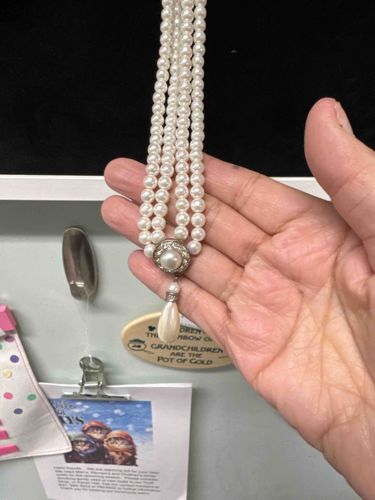Triple Strand Simulated Pearl Necklace with Rhinestone Focal and Teardrop Pendant