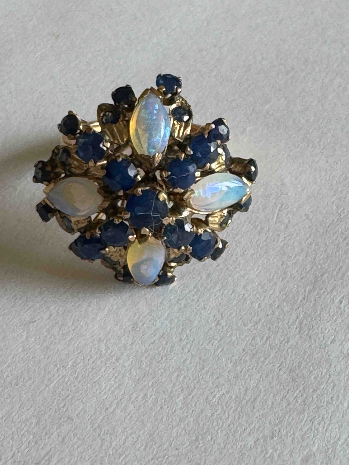 This is a vintage multi-gemstone cluster ring, likely dating from the mid-20th century (circa 1950s-1970s). The ring's face features a tiered architectural design set in a yellow gold mounting, likely 10k or 14k based on the style. The primary ornamentation consists of four marquise-cut cabochon opals arranged in a cardinal compass pattern. These opals exhibit a white-to-milky body color with a visible play-of-color, predominantly showing flashes of blue and green. Interspersed and surrounding the opals are approximately 17 round-cut dark blue sapphires of varying sizes, arranged in a dense, flower-like spray. The sapphires appear to be of a deeper, midnight-blue saturation, showing some natural inclusions typical of the era. The construction utilizes individual prong settings for each stone, concentrated on a raised gallery. Visible condition issues include significant dust and possible lint caught in the central prong settings, requiring a professional cleaning. The opals show a slight dullness of surface luster, which may indicate minor surface abrasions or age-related dehydration. The craftsmanship is typical of mid-century mass-produced fine jewelry, presenting a bold, high-profile 'cocktail ring' aesthetic. No maker's marks or hallmarks are visible in this orientation, but the patina on the gold suggests it is an authentic vintage piece.