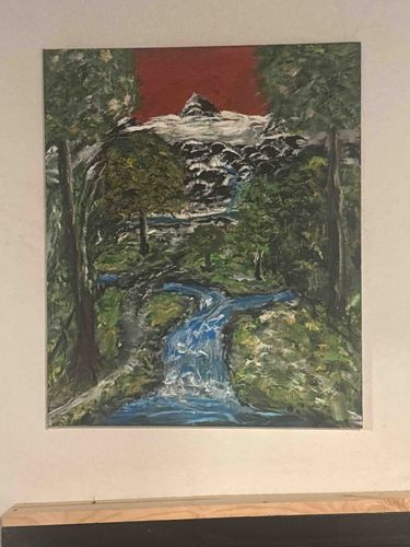 This item is an original landscape painting executed in an expressionist, impasto style on a rectangular stretched canvas. The composition features a central blue river or stream flowing forward from a background of dense, green foliage and darkly-trunked trees. In the upper register, a stylized mountain peak sits beneath a dramatic, solid deep red sky, suggesting a sunset or surreal atmosphere. The medium appears to be acrylic or oil paint, applied with heavy texture and visible brushstrokes or palette knife work to create depth and movement. Physically, the canvas is unframed, showing the painted edges typical of contemporary works. The color palette is dominated by earthy greens, browns, and blues, contrasted sharply by the stark white of the mountain's crest and the bold red sky. There is no visible signature or maker's mark in the lower corners, suggesting it may be a student or amateur folk art piece from the late 20th to early 21st century. The condition appears stable with no obvious flaking or mechanical damage, though some light surface dust is present. The craftsmanship reflects a raw, intuitive approach to nature rather than formal academic realism.