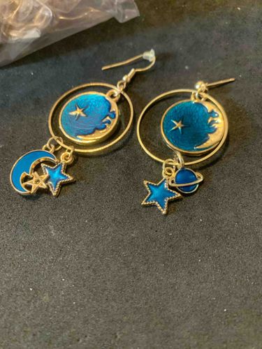 This is a pair of mismatched contemporary fashion earrings featuring a celestial theme. The earrings are constructed from a gold-toned base metal, likely a zinc alloy, with vibrant blue cold enamel (epoxy) filling. Each earring consists of a large outer hoop suspended from a shepherd's hook or post back. Inside the hoop is a central disc depicting a crescent moon with a face and a small star against a textured blue background. Hanging from the bottom of the hoops are smaller charms including stars, additional crescent moons, and a ringed planet (Saturn). The blue enamel features a subtle shimmer or pearlecent effect. One earring uses a French hook (fishhook) wire while the other appears to have a ball-tipped post, suggesting they are a stylized mismatched set or have been modified. The gold plating is bright with no significant signs of tarnish, though the jump rings appear to be standard mass-produced hardware. There are no visible maker's marks, indicating these are likely modern, mass-market costume jewelry rather than artisan-crafted pieces. The condition is excellent with no visible chips to the enamel or scratching to the metal surfaces.
