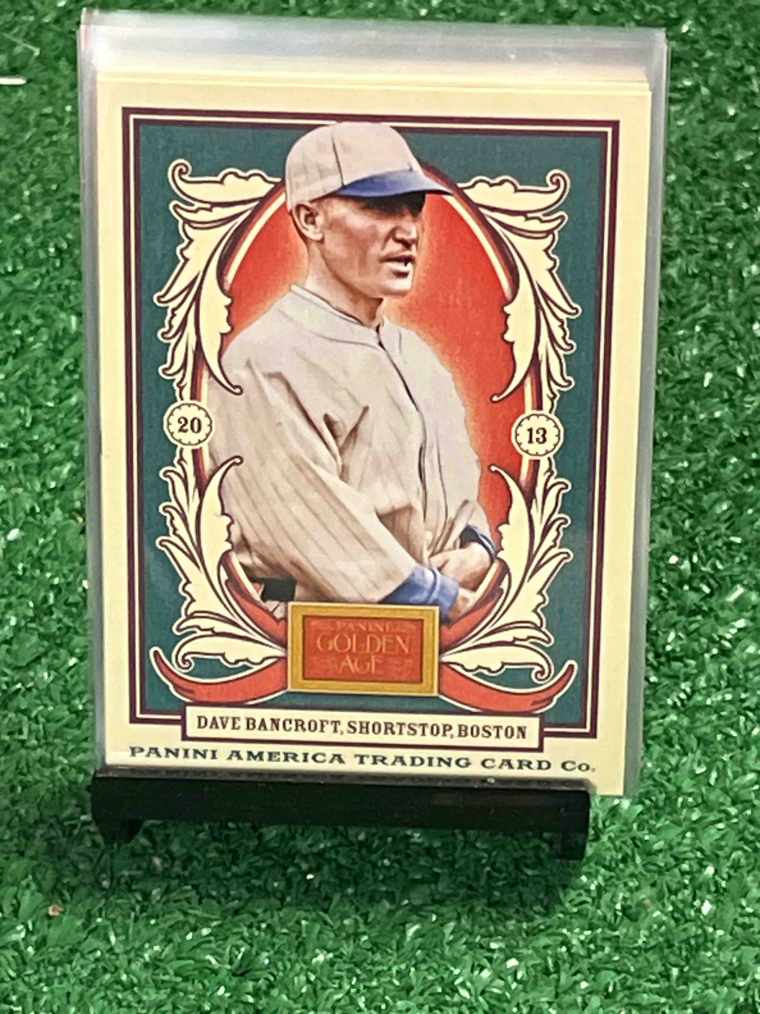 This is a modern collectible baseball trading card produced by Panini America in 2013 as part of their 'Golden Age' series. The card features Hall of Fame shortstop Dave Bancroft during his tenure with Boston. It utilizes a retro-themed aesthetic designed to mimic the lithography styles of the early 20th century. The card is printed on cardstock and measures approximately 2.5 by 3.5 inches. The artwork depicts Bancroft in a cream-colored vintage uniform with a blue-brimmed cap against a vibrant orange and red circular sunburst background. This central image is framed by ornate gold-colored scrollwork and set against a dark teal matte background. Notable markings include the split year '20' and '13' inside decorative circles on the left and right sides of the border. Below the portrait is a gold 'Panini Golden Age' logo box. The bottom white border identifies the player as 'DAVE BANCROFT, SHORTSTOP, BOSTON' and includes the manufacturer's name, 'PANINI AMERICA TRADING CARD Co.' The card appears to be in excellent to near-mint condition, housed in a Protective plastic top-loader sleeve, which has preserved its sharp corners and smooth edges. The colors are crisp and there is no visible wear, surface scratching, or fading. This series was known for its high-quality craftsmanship, blending historical sports figures with modern printing technology and artistic design elements that appeal to both sports historians and hobbyist collectors alike.