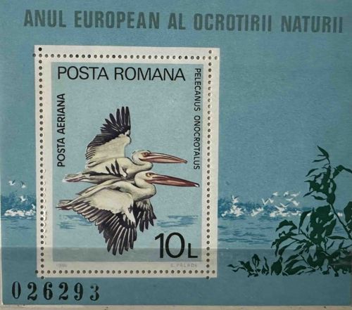 This is a philatelic souvenir sheet issued by Posta Romana in 1970 to commemorate the 'European Nature Conservation Year' (Anul European al Ocrotirii Naturii). The sheet features a single perforated airmail stamp (Posta Aeriana) with a face value of 10 Lei, depicting two Great White Pelicans (Pelecanus onocrotalus) in mid-flight over a stylized wetland background. The stamp is printed using multi-colored photogravure, showcasing white, gray, black, and reddish-orange hues for the birds against a pale blue and green backdrop. The surrounding selvage is colored in a dusty blue with a darker green silhouette of reed-like vegetation in the bottom right corner. Notable text includes the event name at the top in Romanian, the scientific name of the bird species, and the artist's name 'E. PALADE' printed in the lower right margin of the stamp area. The sheet bears a distinct six-digit serial number '026293' printed in black ink in the lower left corner. The condition appears to be mint with original gum, though there is a visible horizontal fold line or crease running across the bottom quarter of the sheet, which significantly impacts the centering and physical integrity of the paper. This issue reflects the typical high-quality illustrative style of Eastern European commemorative stamps from the mid-20th century.