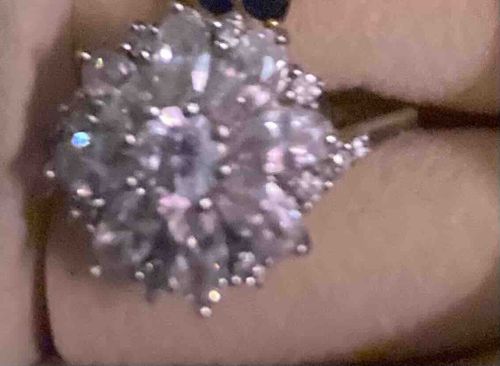 This jewelry piece is a multi-stone cluster ring featuring a floral or snowflake-inspired arrangement. The central focus consists of a primary cluster of colorless stones, heavily appearing to be pear-cut or marquise-cut, radiating from a central point. These stones are held in place by small silver-toned prongs, likely made of white gold, platinum, or sterling silver. Surrounding the larger central stones is a secondary halo of smaller round-cut stones, creating a textured 'sunburst' effect. The overall construction is tiered, giving the ring noticeable height and dimension. While the image is slightly blurred, the stones exhibit high brilliance and faceted reflections, suggesting they are either high-quality diamonds or stimulants like cubic zirconia. The band appears thin and delicate, typical of late 20th-century or contemporary fashion jewelry. There is no visible maker's mark or metal purity stamp from this angle, but the setting shows complex prong work and a high-polish finish. The condition appears fair to good, with no obvious missing stones, though light surface scratches on the metal are consistent with occasional wear.