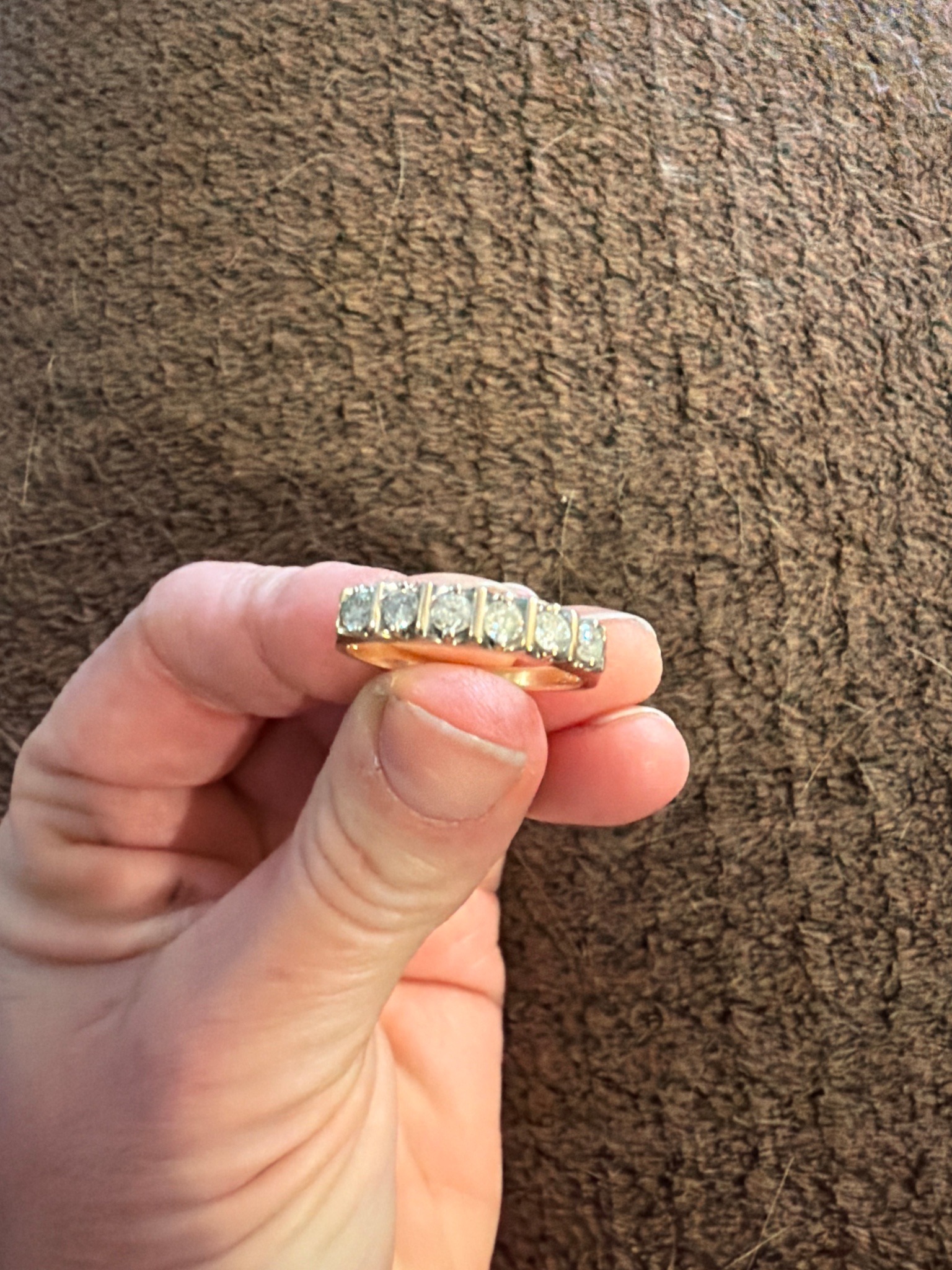 This is a classic straight-row eternity-style wedding or anniversary band featuring seven round brilliant-cut diamonds. The ring is constructed with a yellow gold shank, likely 14K or 18K purity, which transitions into a semi-channel or bar-set design where the stones are held in place by vertical gold walls. The diamonds are graduated or uniform in size, appearing to be approximately 0.10 to 0.15 carats each, totaling roughly 0.70 to 1.00 carat in weight. The setting style provides a contemporary aesthetic while offering protection to the stone edges. Physically, the shank shows a polished finish with moderate superficial scratches consistent with regular wear. There is no visible sign of thinning at the base of the band or evidence of previous resizing, though the interior hallmarks are not visible from this angle. The stones appear clear and well-matched in color, though a minor buildup of debris is visible beneath the settings, suggesting the need for professional ultrasonic cleaning. The overall style is reminiscent of late 20th-century jewelry design, likely dating from the 1990s to the early 2000s. The craftsmanship indicates a mass-marketed but high-quality production, typical of fine jewelry retailers.