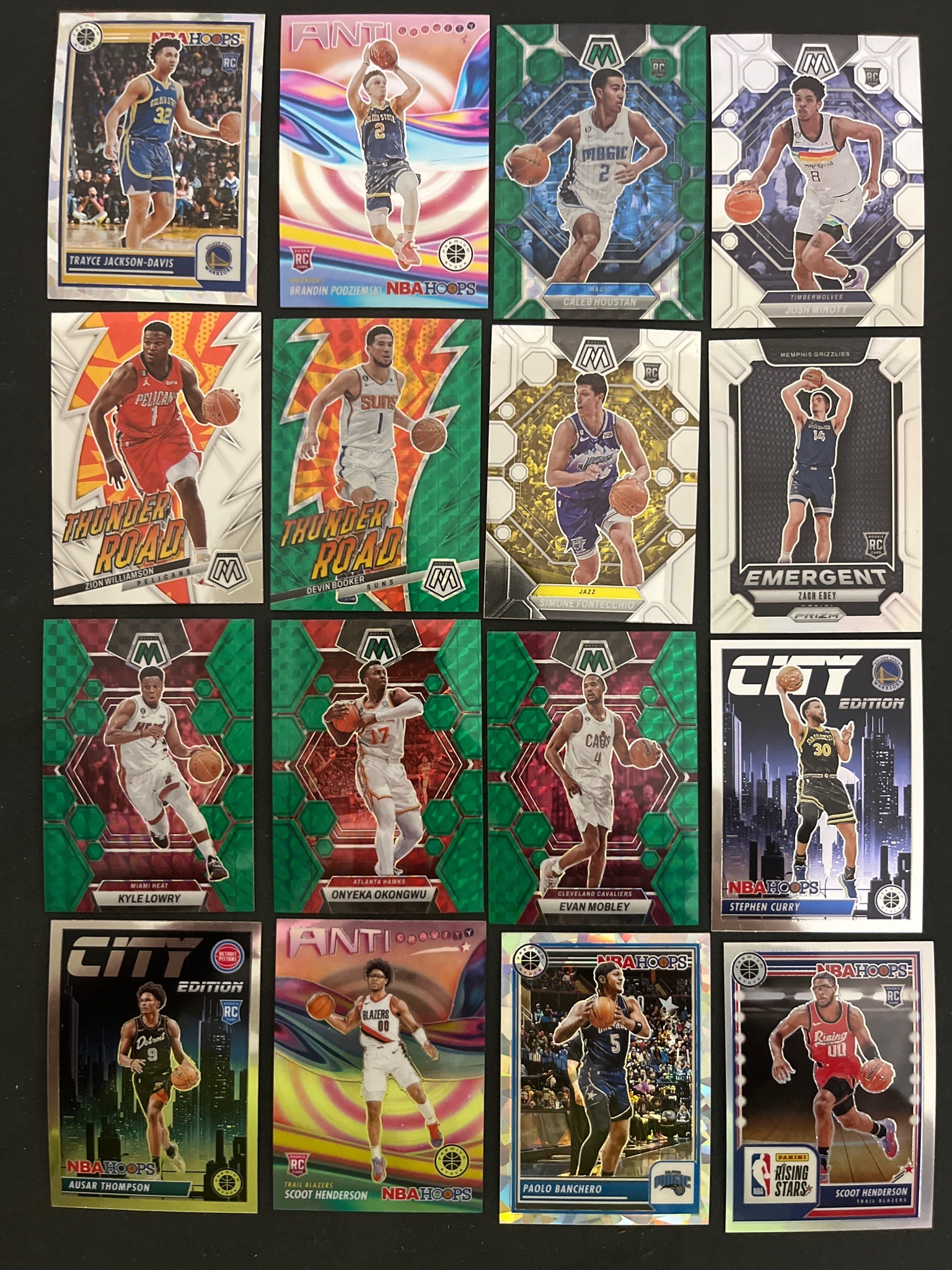 This is a diverse collection of 16 modern Panini NBA trading cards, primarily featuring sets from the NBA Hoops, Mosaic, and Prizm lines spanning roughly the 2022-2024 seasons. The lot includes several sought-after subsets such as 'Anti-Gravity,' 'Thunder Road,' 'City Edition,' and 'Emergent.' Notable individual athletes represented include stars like Stephen Curry, Devin Booker, and Zion Williamson, alongside key rookie cards (RC) like Scoot Henderson, Ausar Thompson, and Zach Edey. The cards showcase various parallel finishes, including green mosaic prisms, silver holofoil effects, and stylized graphic backgrounds. Physically, the cards appear to be in standard size (2.5 x 3.5 inches) with sharp corners and clean edges visible, suggesting a Near-Mint to Mint condition, though they are currently shown without protective sleeves or top-loaders. The printing features high-gloss finishes and intricate foil stamping typical of high-end modern sports card manufacturing. No significant surface scratches, creasing, or edge wear is immediately apparent in the provided image.
