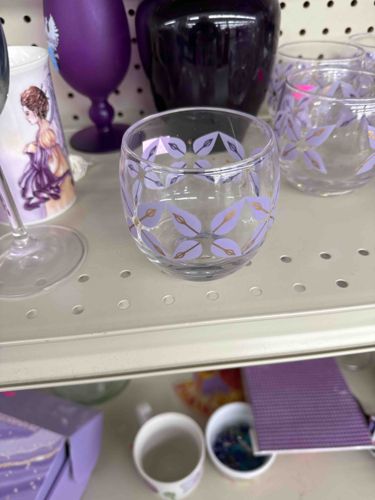 This is a stemless wine or juice glass featuring a clear glass body decorated with a repeating lavender and gold geometric floral pattern. The design is specifically inspired by the 'Sundrop Flower' or the sun icons from Disney's Rapunzel (Tangled). The glass has a rounded, bulbous shape that tapers slightly toward the rim. The primary decoration consists of four-petal lavender leaf-like shapes arranged in a diamond pattern, with a gold metallic flourish in the center of each leaf. The glass appears to be part of a set, as matching glasses are visible in the background. The construction is mass-produced molded glass, common for contemporary licensed drinkware from the late 2010s to present. In terms of condition, the glass appears clean without visible chips or cracks at the rim, though there is a slight vertical smudge or surface streak on the upper portion that may be a fingerprint or minor scuff. The silkscreened graphics appear intact with no significant fading or metallic loss. The quality is consistent with standard high-street character merchandise, likely sold at retailers like BoxLunch, Hot Topic, or Disney Parks.