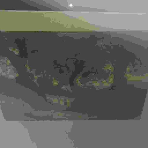 This is a horizontal rectangular abstract painting, likely oil or acrylic on canvas, depicting a dark, atmospheric scene that suggests a landscape or a reflective body of water at night. The composition is dominated by deep charcoals, blacks, and dark grays, punctuated by expressive impasto applications of chartreuse, olive green, and muted ochre. These brighter tones are clustered in the center and right foreground, resembling mossy rocks, lily pads, or bioluminescence. The brushwork is gestural and textured, showing visible layering and a possible palette knife technique that provides depth and a tactile surface quality. The top portion of the work features a horizontal band of lighter, grayish-green, suggesting a distant horizon or murky sky. In terms of condition, the canvas appears taut, though the image exhibits significant digital compression artifacts which obscure fine detail. No artist signature is immediately visible in the lower corners. The style appears contemporary, likely late 20th or early 21st century, following in the tradition of abstract expressionism mixed with naturalistic color palettes. The craftsmanship is evidenced by the sophisticated use of dark values and the intentional, energetic placement of highlights to create a sense of mystery and depth within a limited color field.