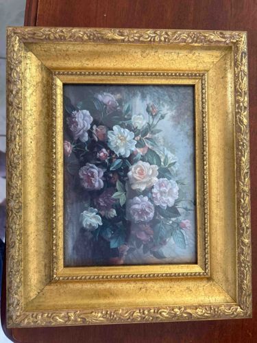 This item is a framed floral still life picture, likely a high-quality reproduction of a work by the English painter Albert Williams (1922-2010), known for his intricate botanical studies. The artwork features a lush arrangement of multi-colored roses including shades of pink, white, and pale lilac, set against a muted, dark background that accentuates the highlights of the petals. The image is housed in a substantial, decorative wood or composite frame with a vibrant gold leaf or metallic gilt finish. The frame construction is elaborate, consisting of a wide cove profile with a repeating floral and foliate relief pattern on the outer edge, and a classic bead-and-reel motif on the inner lip. The finish shows a gentle aged patina with some minor scuffing and dust accumulation, but generally remains in good cosmetic condition. The print itself appears well-preserved behind glass, though its specific medium (lithograph or canvas print) would require physical inspection. Based on the style of the frame and the subject matter, this piece likely dates from the late 20th century, approximately 1970-1990. The overall craftsmanship reflects a decorative commercial standard aimed at traditional interior aesthetics.