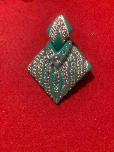 This is a vintage costume jewelry brooch, likely dating from the mid-to-late 1980s, designed in a bold Art Deco Revival style. The piece features a geometric, kite-shaped silhouette with a tiered, architectural construction. It is crafted from a base metal, predominantly finished in a vibrant turquoise-teal cold enamel or resin. The item is heavily accented with clear round-cut rhinestones set in a silver-toned pav settings. The design incorporates vertical fluting and chevron patterns, characteristic of the '80s take on '20s aesthetics. The central focal point is a larger bezel-set rhinestone situated at the apex of the lower segment. Physically, the piece appears robust with thick material layers. In terms of condition, there is visible wear to the enamel along the raised edges and points where the base metal is peaking through, suggesting it was a frequently worn accessory. The silver-tone plating shows slight tarnishing or oxidation in the recessed areas between the stones. No maker's marks are visible from the front view, though the craftsmanship suggests high-quality mass-market fashion jewelry from brands like Trifari, Monet, or Avon of that era. The overall aesthetic is large and statement-oriented, typical of the 'power dressing' fashion trends of its time.